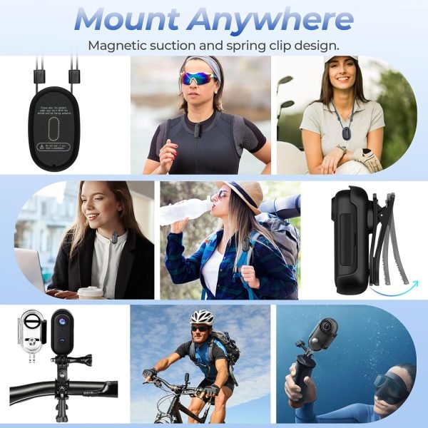 MOUNT ANYWHERE: The sports camera features a magnetic design, allowing you to attach it to an Iron metal surface. It also comes with a magnetic lanyard pad that lets you quickly mount it to your chest in just one second. With a 360° rotating spring clip, you can effortlessly secure the camera to your collar, pocket, waist, and more. Additionally, it includes seven other mounting accessories, making it easy to attach to bikes, motorcycles, helmets, and other gear.
