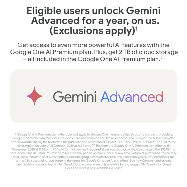 Meet Pixel 9 Pro Fold with Gemini. It’s engineered by Google and brings you the best of Google’s AI first. With a display of epic proportions, you can multitask in Split Screen and enjoy immersive entertainment.1 Snap brilliant selfies with the powerful rear camera, and use tabletop mode for hands-free pics.